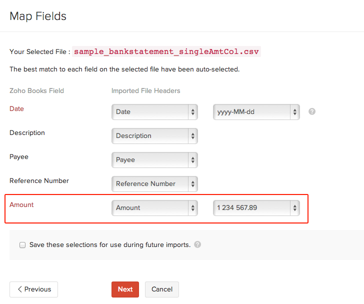 If the file you imported has one column where positive values indicate deposits and negative values indicate withdrawals, then select the headers as shown in the image below.