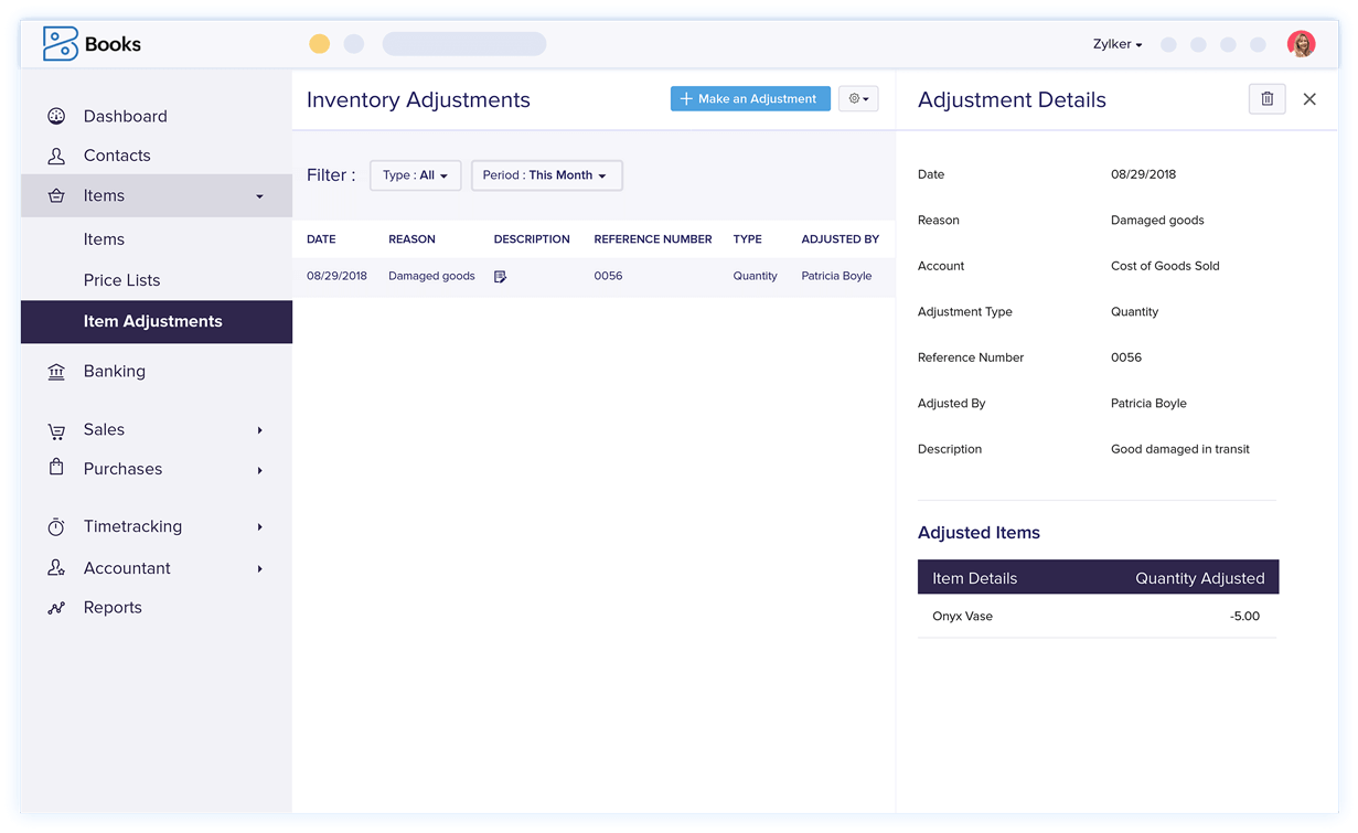 Easily account for any change to your inventory quantity or value of an item or a composite item. Handle damages, unavailability, or increase/decrease in value easily with inventory adjustments.