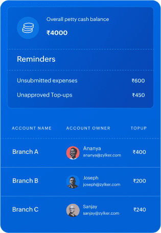 Petty cash can be hard to track. But not anymore! With Zoho Expense's imprest account management, easily request, receive, and track your petty cash. Ensure transparency with detailed approvals and a comprehensive view of your petty cash expenses across all branches.