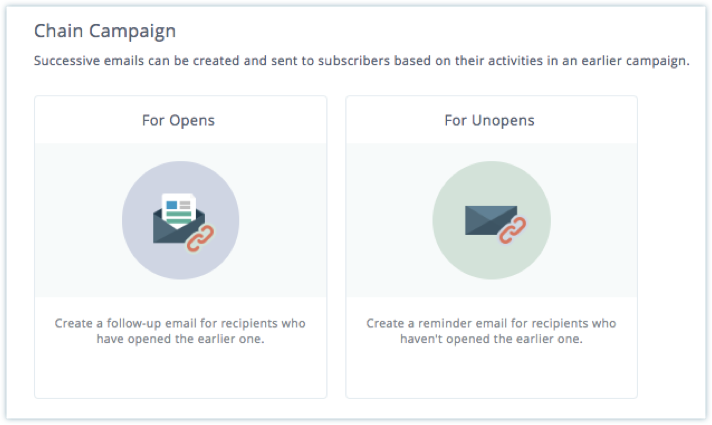 A chain campaign allows you to retarget the recipients of previously sent campaigns, based on their opens or unopens. Chain campaigns are not restricted to just one follow-up campaign, you can create as many campaigns as you want, in order to achieve the desired results.