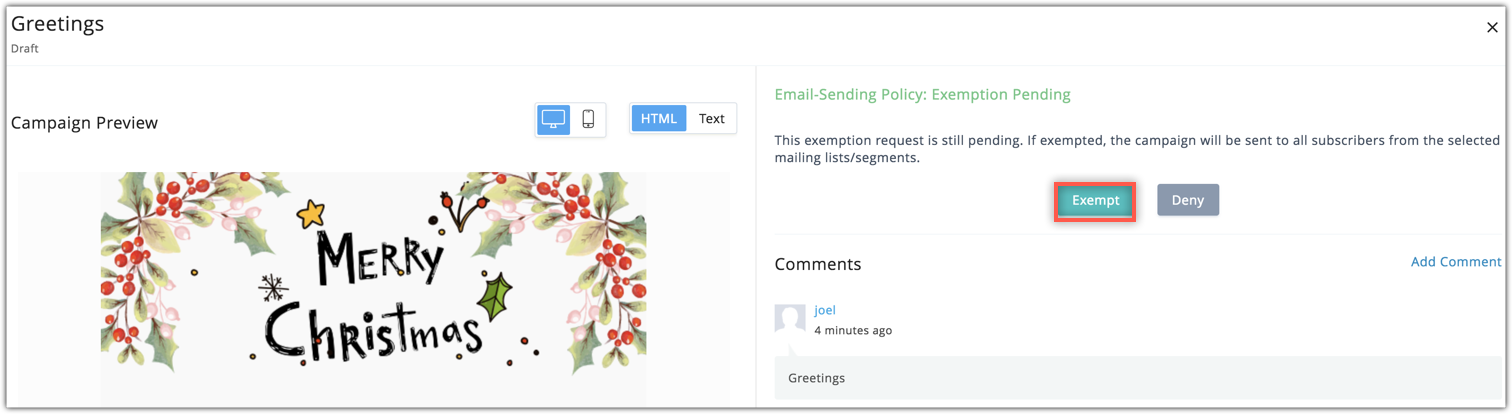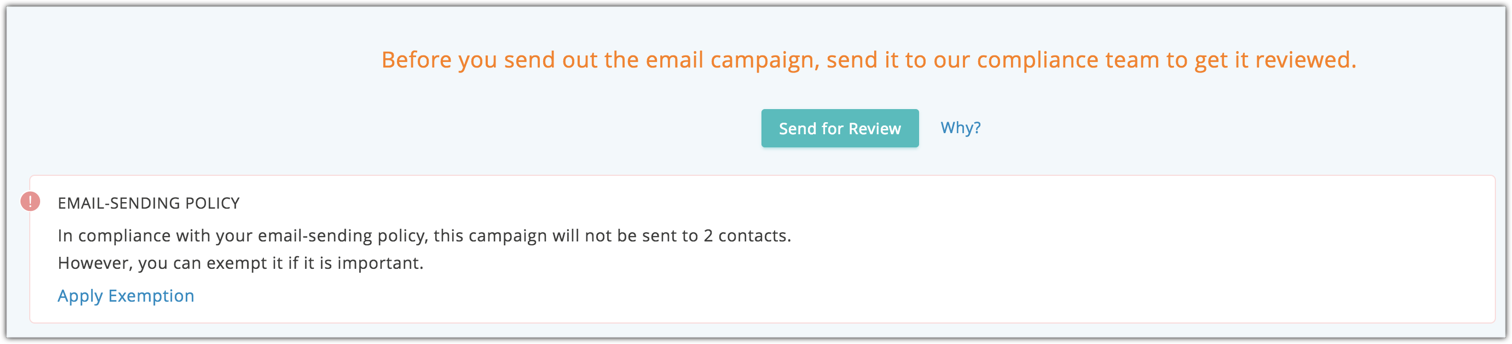 If you're sending a crucial email campaign, and you know that some of the recipients will be blocked by the email policy, you can request an exemption for the campaign from your administrator. Once the administrator approves the exemption, the contact will be able to receive your email.