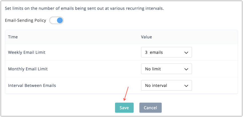 Let's suppose our administrator has set the number of emails a contact should receive in a week at three, and the time interval between emails is two days, i.e., 48 hours. Under this policy, say you plan to send contacts the first email for the week on Sunday at 8.00 AM, and the next two on Tuesday and Thursday each after 48 hours the previous email was sent. All three will go through since they don't violate the email policy.