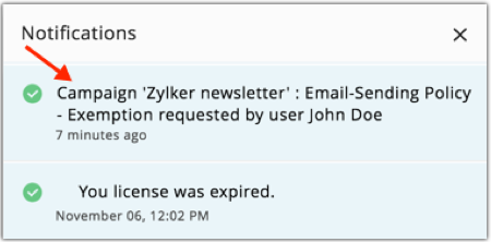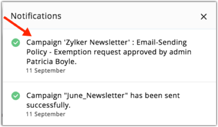 Administrators get notified via the notification bar when a campaign has been requested for exemption, which they can then either exempt or deny.