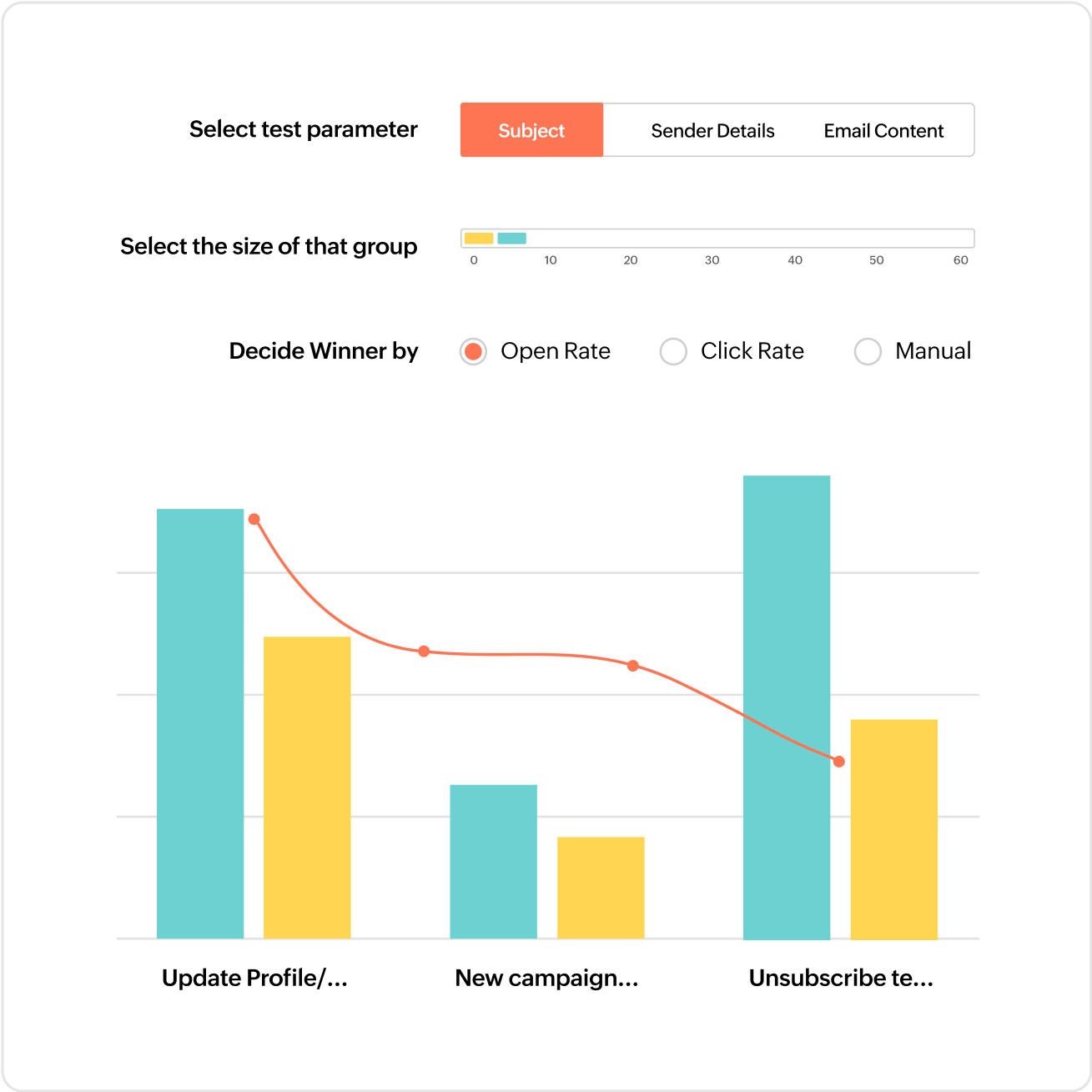 Start by sending out your campaigns to your most engaged audiences and run A/B tests to identify winning subject lines, sender details, and email content. Check live reports to see how your emails are performing and optimize to achieve the desired results.
