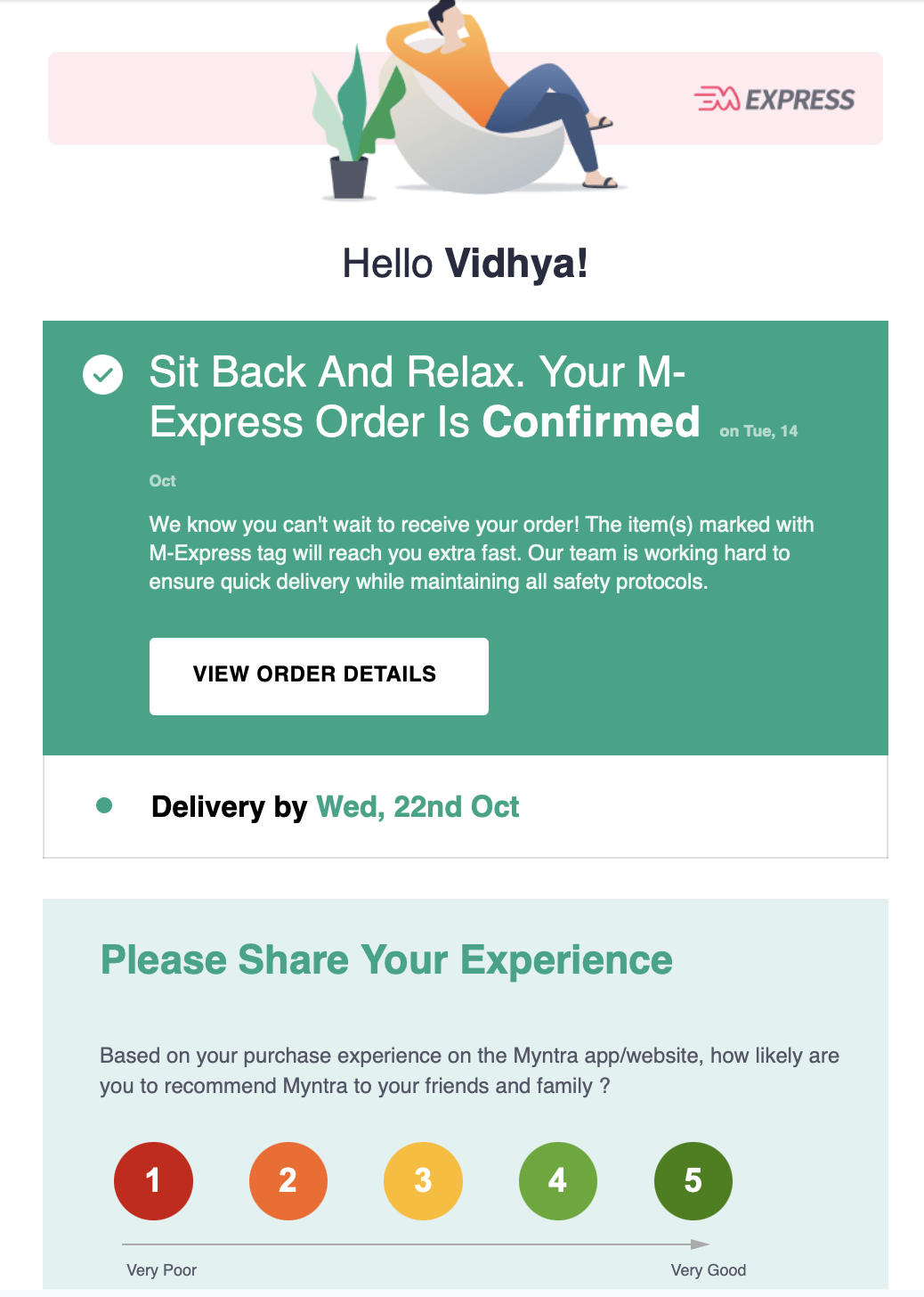 You can request feedback about the customer’s shopping experience in your order confirmation mail. This email from Myntra is a great example of combining a transactional order confirmation with a feedback/rating request.