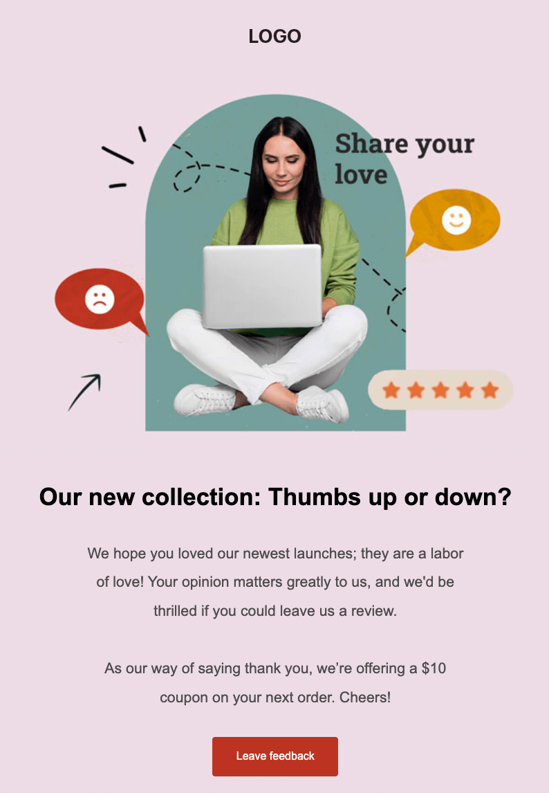 Survey mail: Send an email asking your customers to take a detailed survey on your product or their purchase experience. You can offer an incentive like a gift card or an exclusive discount on their next purchase for completing the survey. This is a great way to get insights on your products and your customers’ buying journey. This also shows your customers that your genuinely care about improving the experience for them, leading to improved customer loyalty.
