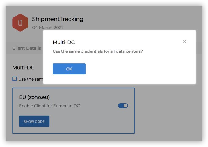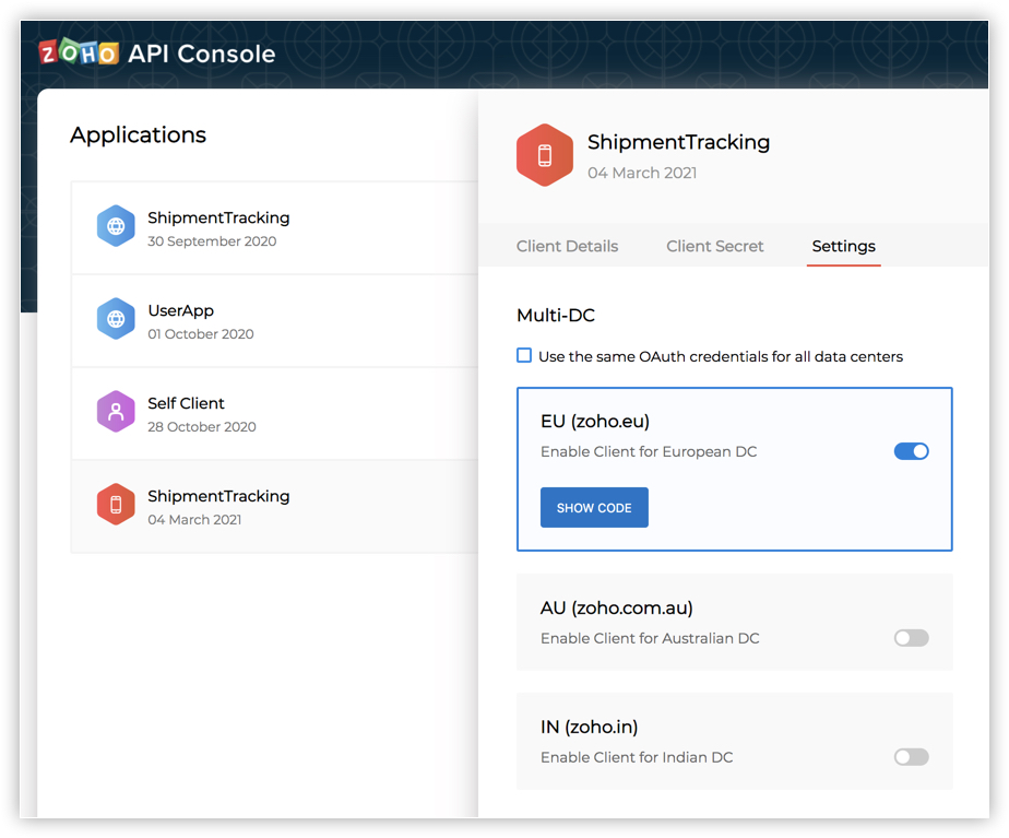 When you enable it for the EU or IN DC, the console will generate a different client_secret for them by default. You can access it by clicking Show Code for the respective DC. The client_id will remain the same for all DCs.