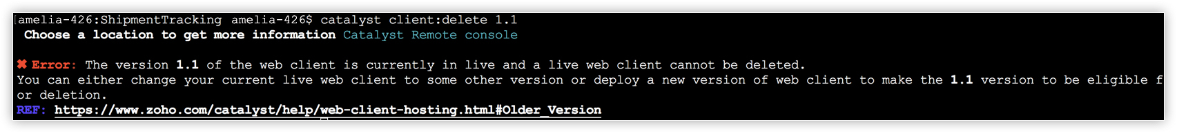 - If you execute the catalyst client:delete [options] [client_version] command to delete a live version of the client, the CLI will inform you that a currently live client cannot be deleted. It will also suggest that you could make a different version live or deploy a new version of the client before attempting the deletion operation again. It will also provide you a help link to the specific section in the CLI documentation that contains a detailed explanation.