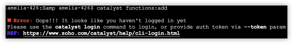 - If you execute a CLI command while being logged out from your Catalyst remote account, the CLI will inform you that it was unable to authenticate your command execution. It will suggest that you log in to your account or execute the command with a valid auth token, and provide a help link.