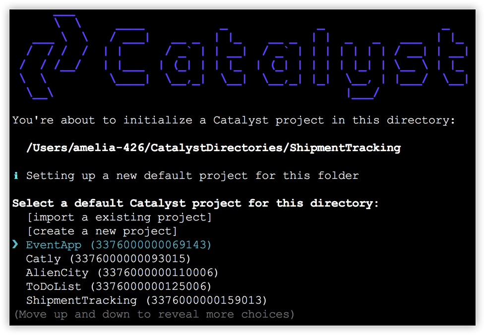 - To select an existing Catalyst project, select from the list of your projects using the arrows. Press Enter to confirm.