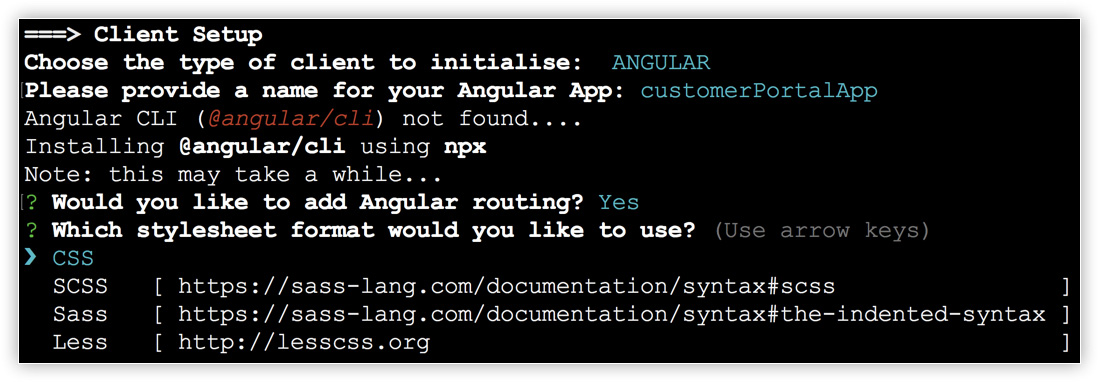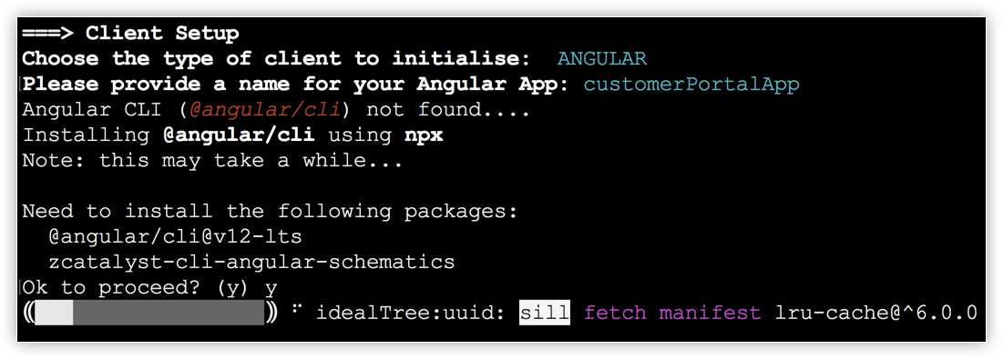 It is recommended that you have Angular CLI installed in your local machine for developing Angular client applications. This CLI handles the installation and configuration of the required dependencies automatically, and enables easy development and testing of client applications. Catalyst will automatically initiate its installation during the client initialization process.