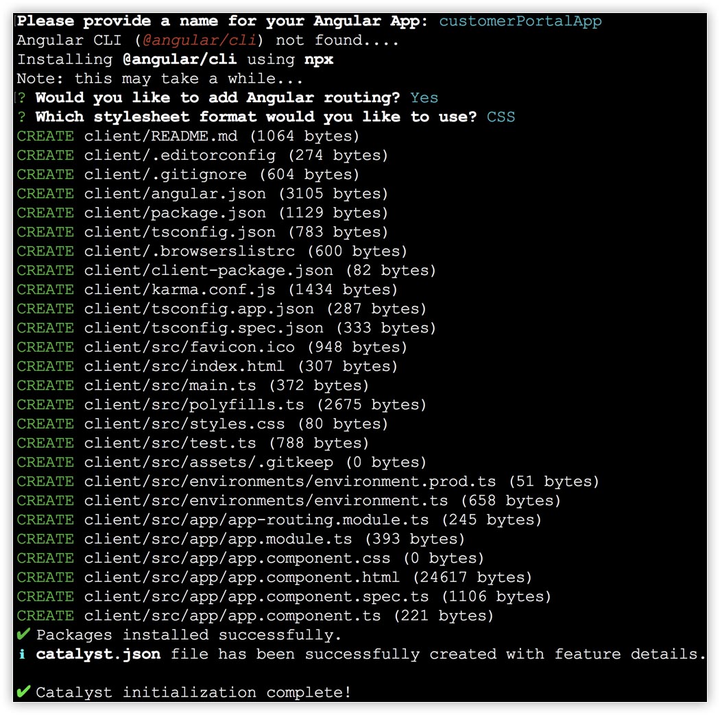 Catalyst will then initiate the installation of the Angular application files, configuration files, and dependencies in their boilerplate structures. The node modules required for the development of the app are also installed through NPM.