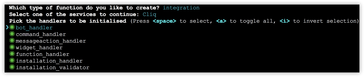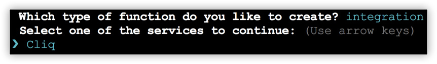 The CLI initialization process is the same for all the other function types, except the Integration functions. If you select Integration from the list, you have to perform these two extra steps before moving on to the next step: