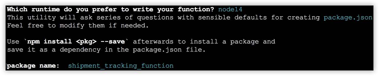 - If you initialize a Node.js function, provide a package name for your Node function when prompted and press Enter.