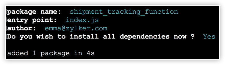 - The CLI will then prompt you to allow installation of node dependencies. Press Y to confirm the installation, and press Enter to confirm your choice. If you don't install all the required dependencies, it could cause errors during the function's execution.