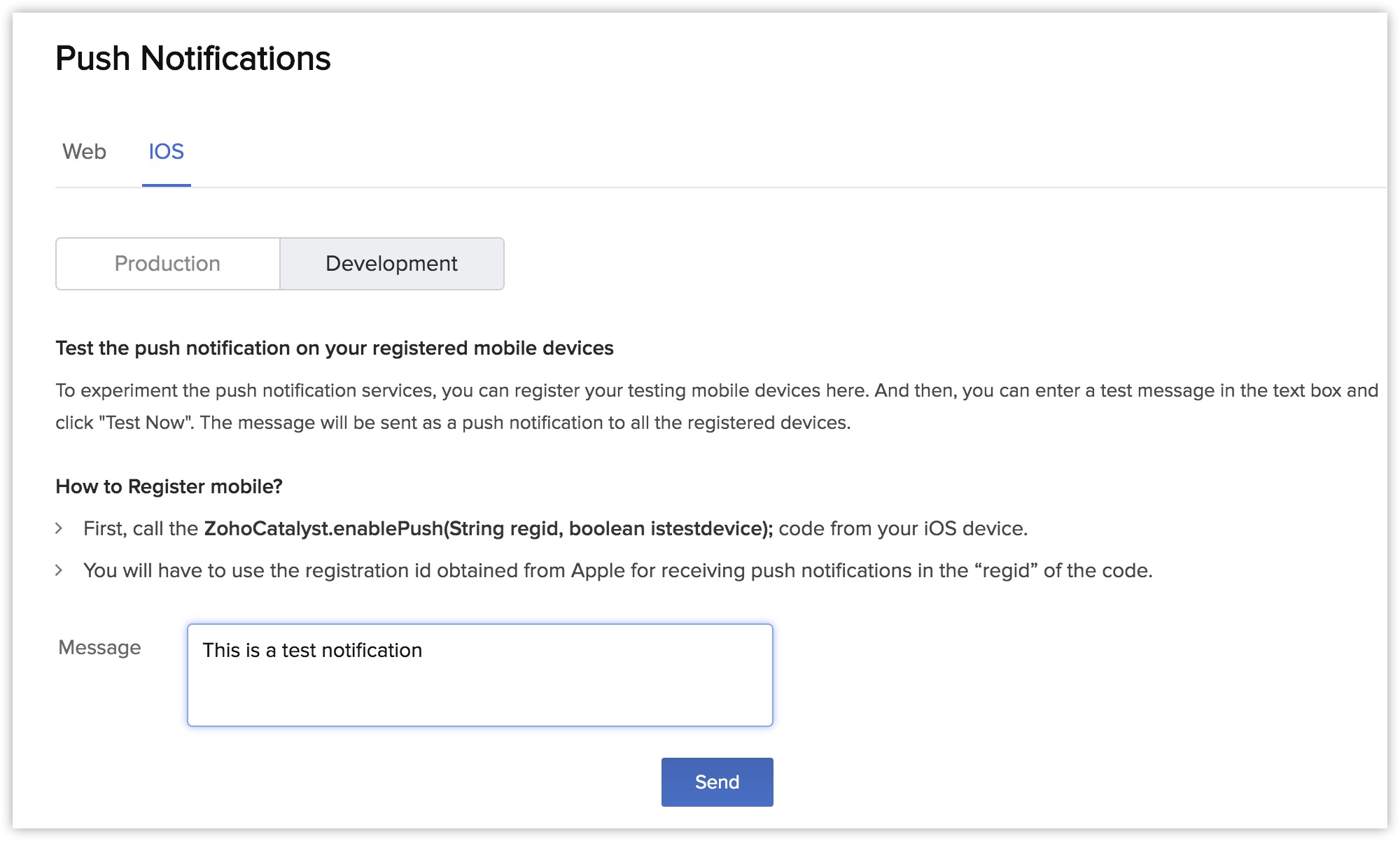 Zoho Catalyst provides you with an easy way to integrate push notifications into your web and iOS applications. For web applications, you can incorporate a code snippet that Catalyst provides into your application's source to enable push notifications in it. For iOS applications, you can easily authenticate your app's APNs configuration with Catalyst, and allow it to forward the push messages that you require. You can also send test notifications to select devices from the Catalyst console for both web and iOS applications, to verify if they are enabled and are working correctly.