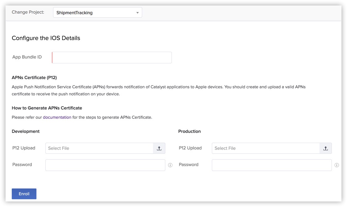 Upload the APNs certificate in the .p12 format under development, production, or both, based on your requirements. Enter the password that you created while saving your APNs certificate in .p12 format. - Click Enroll.