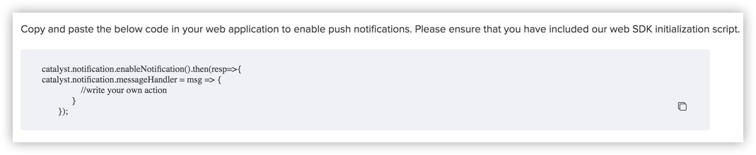 The code snippet provided by Catalyst for the web platform also handles the registration process of the user devices to receive push notifications from the application. You do not need to register the user devices exclusively. You can enable push notifications and start testing them from the console.