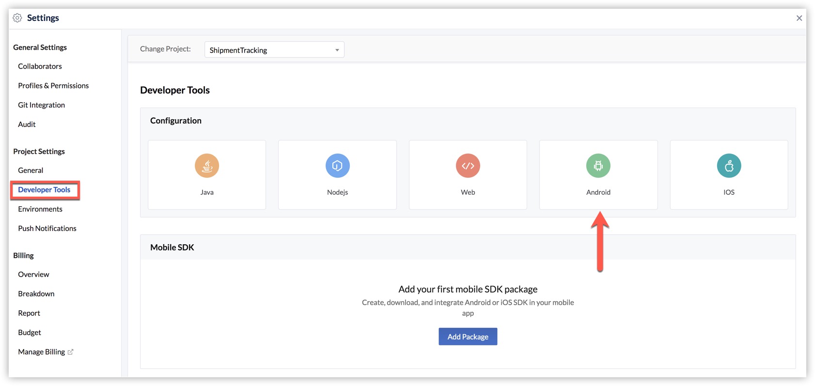 - Navigate to Developer Tools under Project Settings in the settings menu, then click on the Android tile.