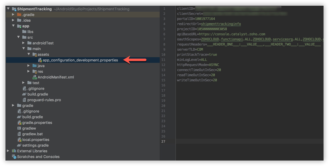 - If the values of the clientID, clientSecret, projectID, or portalID are modified in the configuration file, it will affect the functioning of the SDK and your Android app. If you wish to change any of these configurations, you can create a new package for the required project from the Developer Tools section and download a new configuration file for the appropriate environment, and add it to the assets directory in your app's structure.