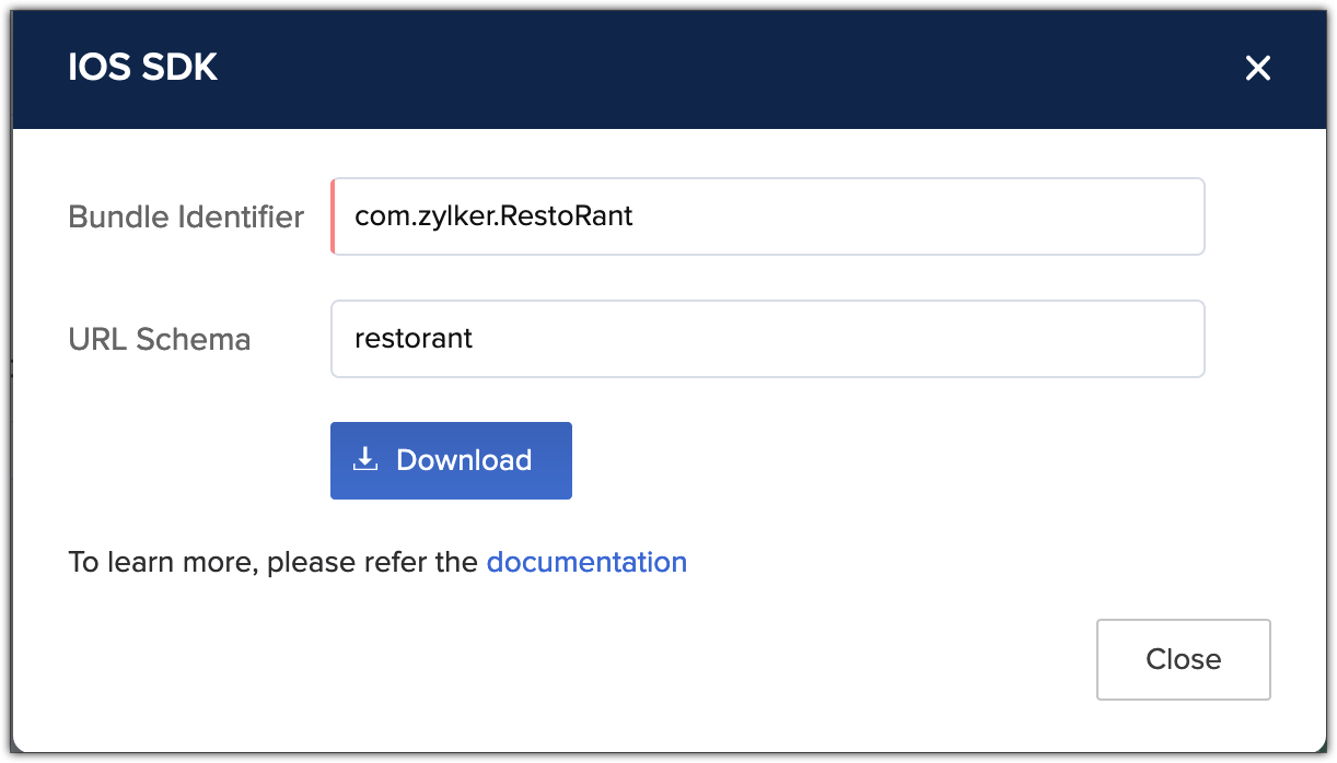 - Click the iOS option from the above screen which opens an iOS SDK pop-up window.