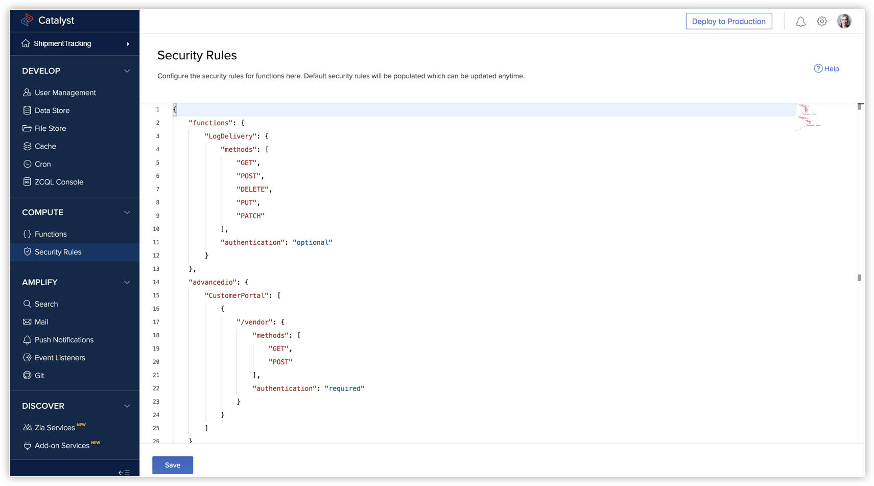 You can access and customize security rules definitions for each function from the Catalyst console. As mentioned earlier, the security rules definitions are created for a function automatically when it is created. Similarly, if you delete a function, Catalyst will delete its security rules definitions automatically.