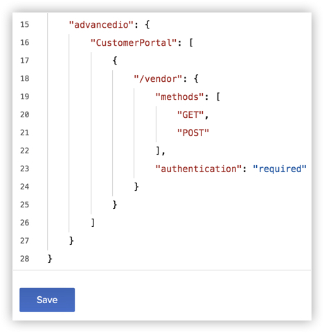 You can configure different definitions for each route defined in an Advanced I/O function individually. For example, if you have defined two routes called /vendor and /customer in the function, you can enable or disable specific methods and the authentication for each route independently like: