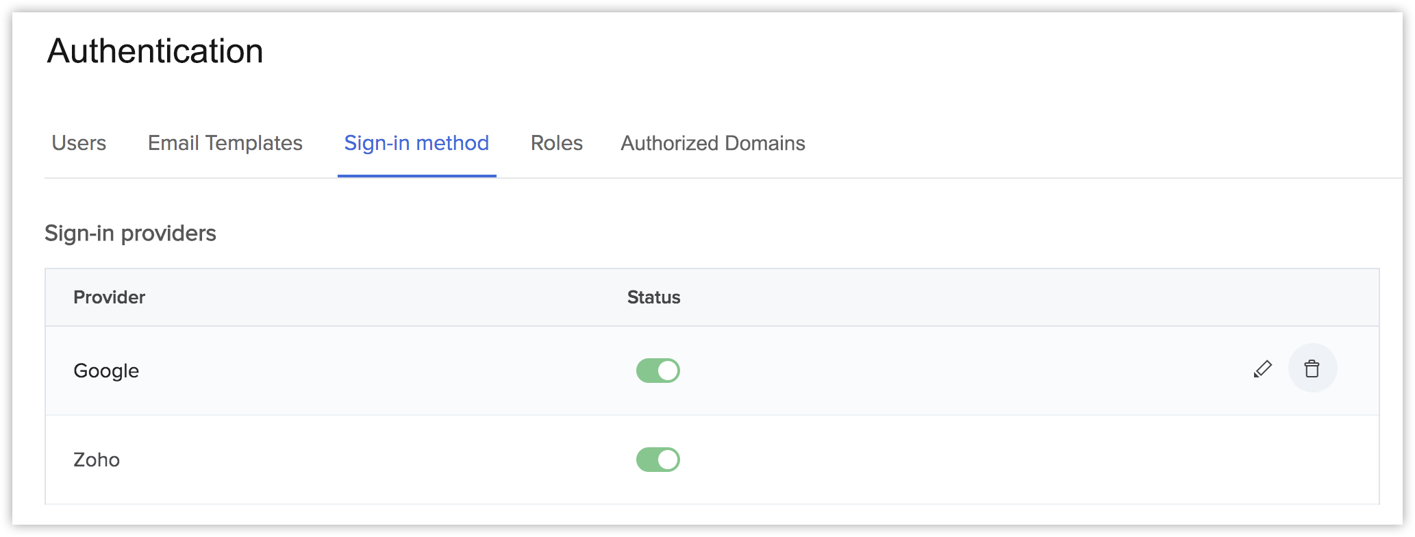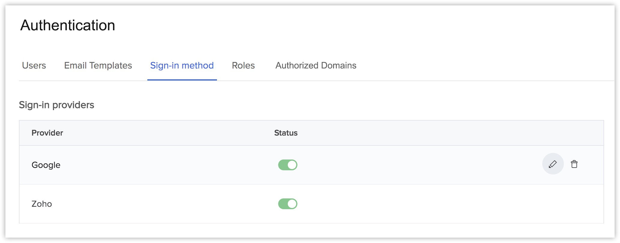 - To enable the Zoho sign-in provider option for your application, click the toggle switch for Zoho in the Sign-in providers section. If you are enabling the sign-in method for the first time, this will open a pop-up window.