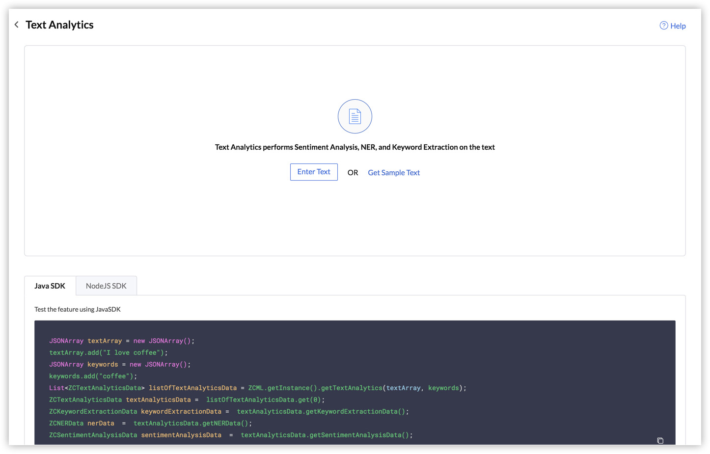 As mentioned in the introduction, you can implement Text Analytics in your Catalyst application in the Java and Node.js platforms. The console provides the code templates for both these platforms, below the test window.