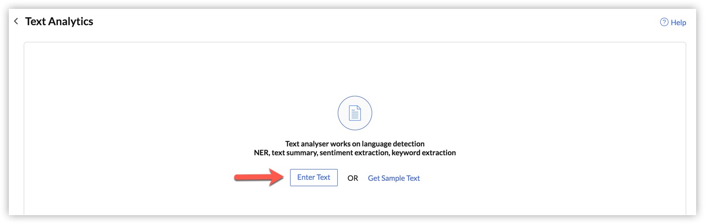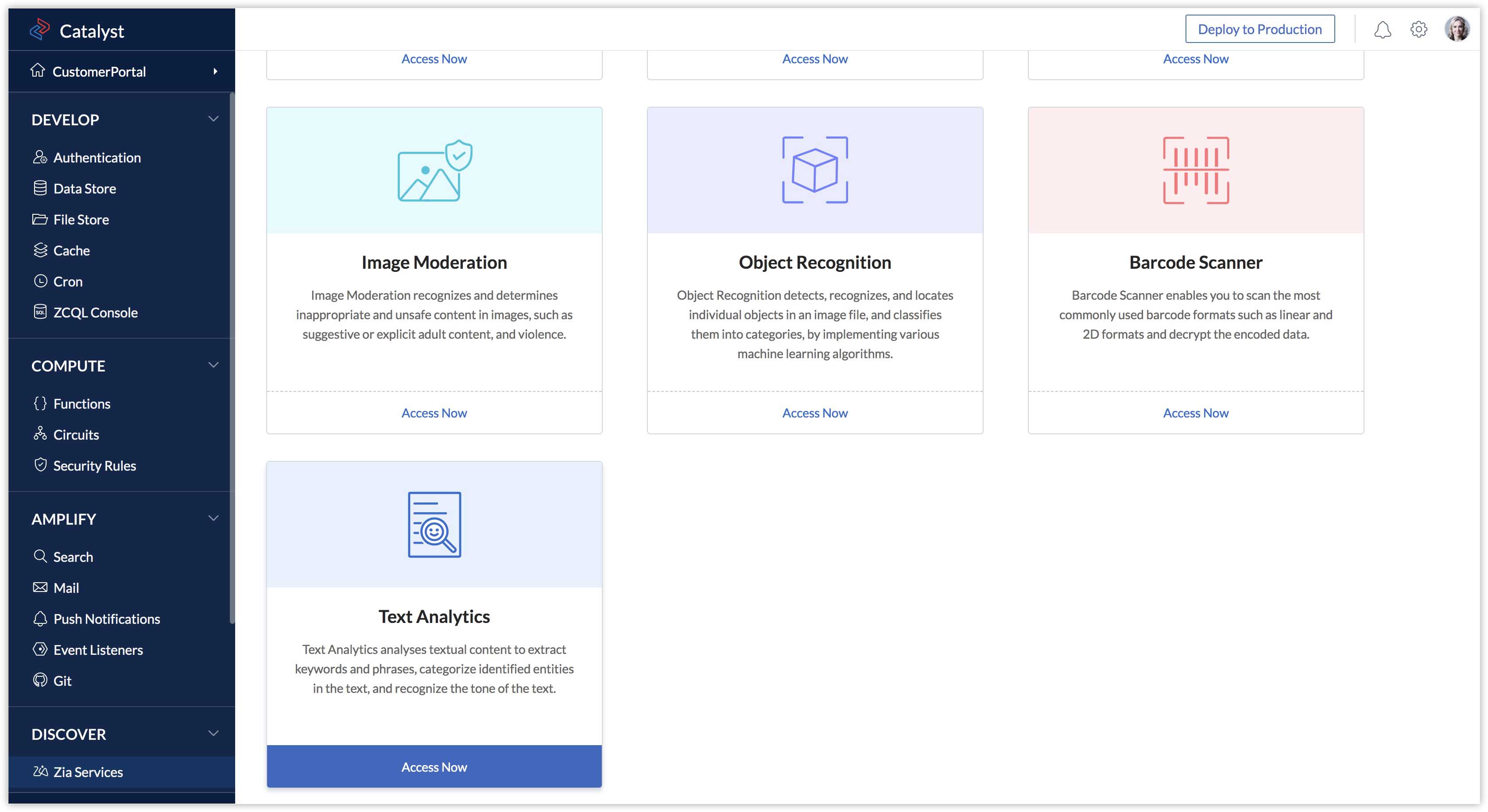 - Navigate to Zia Services under Discover. Scroll down to Text Analytics and click Access Now.