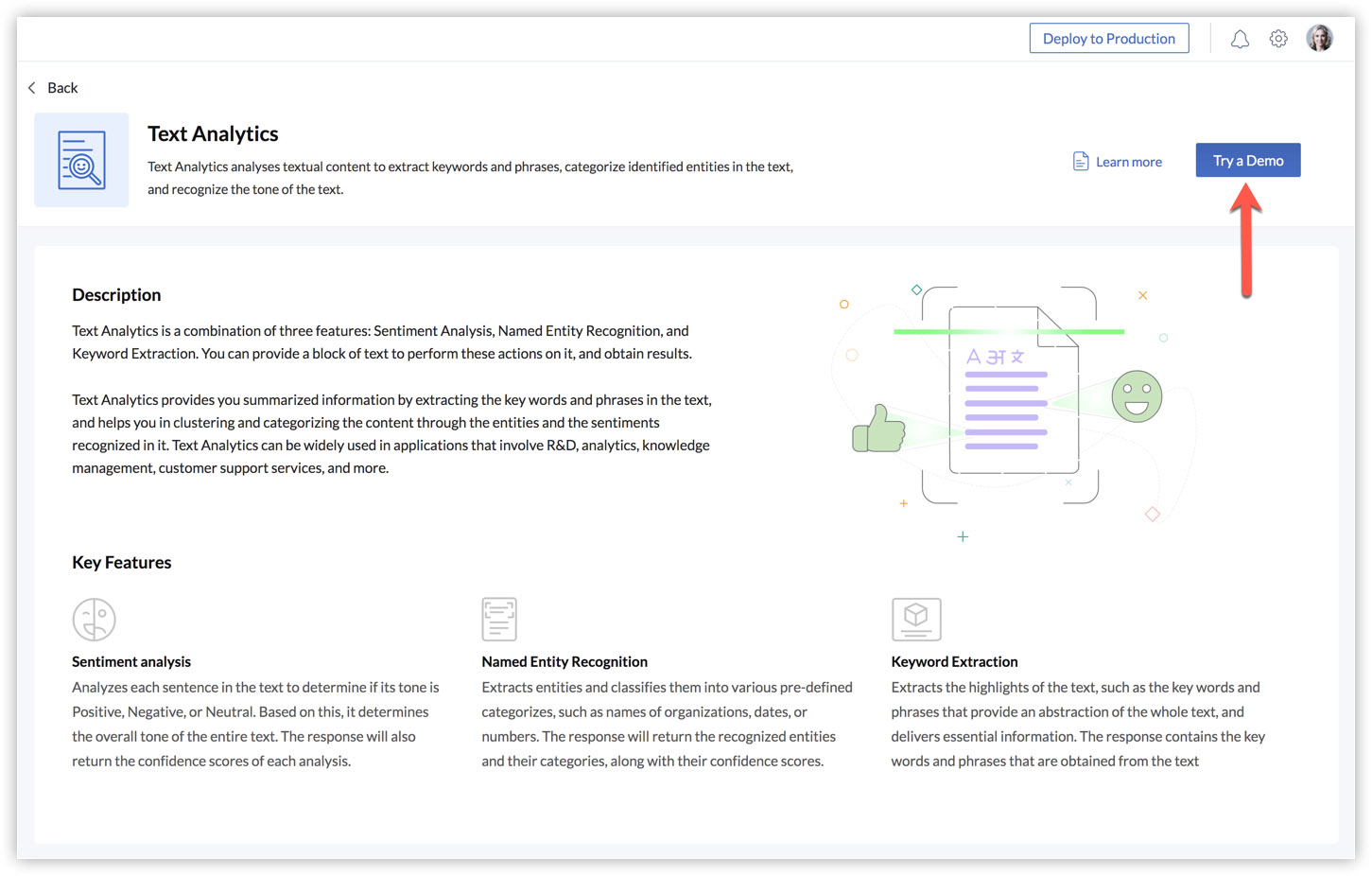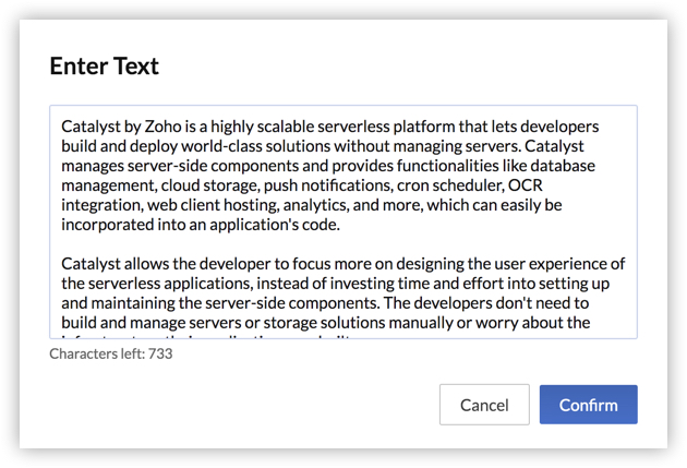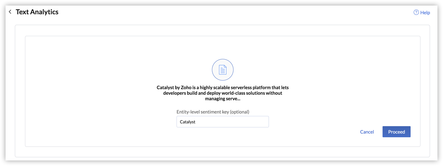 Text Analytics is a Catalyst Zia AI-driven service that processes textual content to draw structured and quantitative information from it. Text Analytics enables you to obtain useful insights, patterns, and trends from any textual content, which helps you automate the analysis of crucial data and make informed business decisions. It can be widely used in applications that involve R&D, analytics, knowledge management, customer support services, and more.