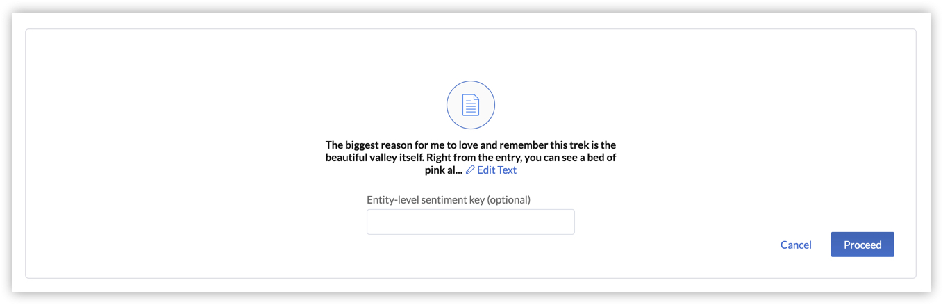 - Enter the optional keywords for Sentiment Analysis if you need, then click Proceed. Refer to the previous section on processing a sample text for details about this.