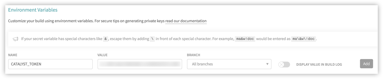 - Add the CLI token as an environment variable by entering the name as "CATALYST_TOKEN" and the token's value under value. You can select a specific branch of your repo, if needed. Click Add.