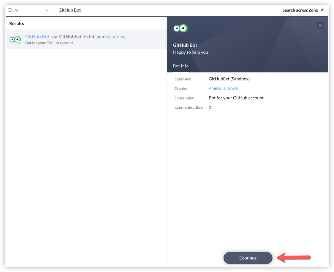 - Search for the GitHub bot in your Cliq account. Select the bot and click Continue.