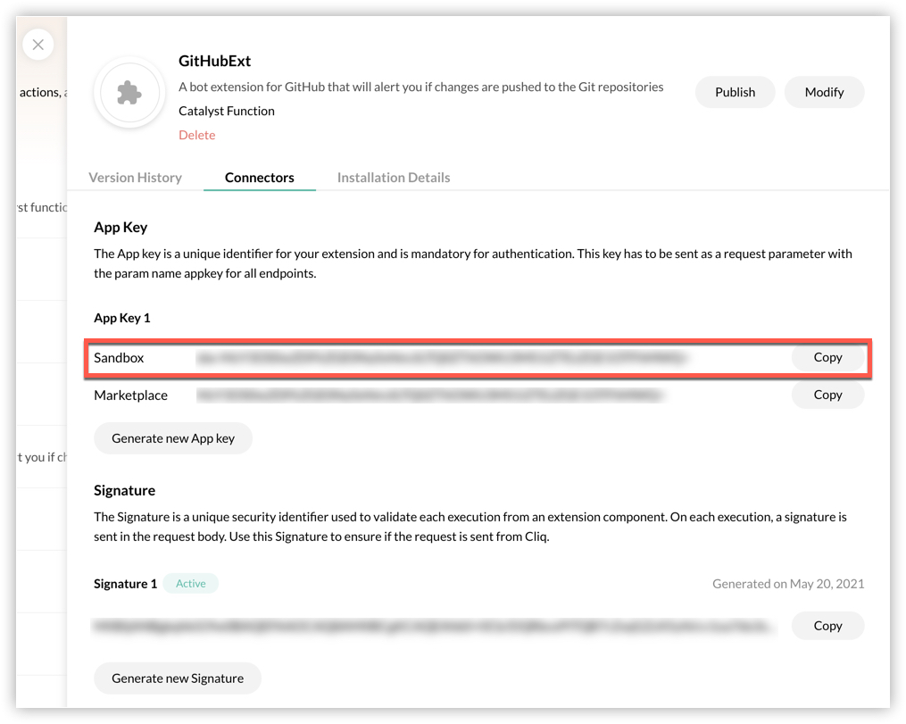 - Copy the Sandbox App Key of your extension.