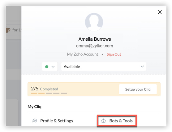 - Navigate back to your Cliq account and click on your profile picture. Click on Bots & Tools in the menu section.