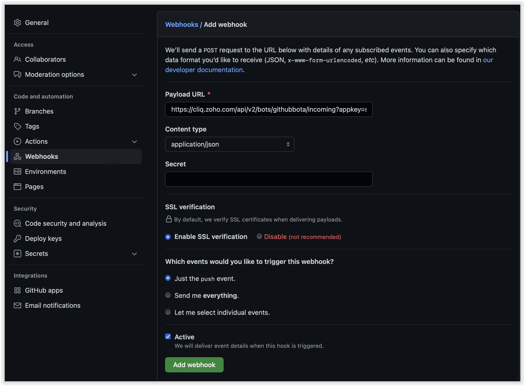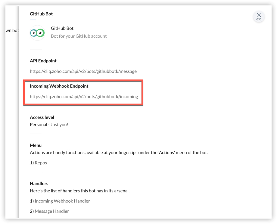 https://cliq.zoho.com/api/v2/githubbot/incoming?appkey={{appkey}}&zapikey={{zapikey}}