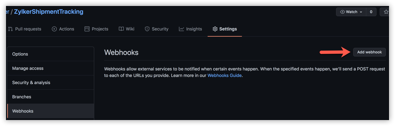 - Open your repository's settings, then click Webhooks -> Add webhook.