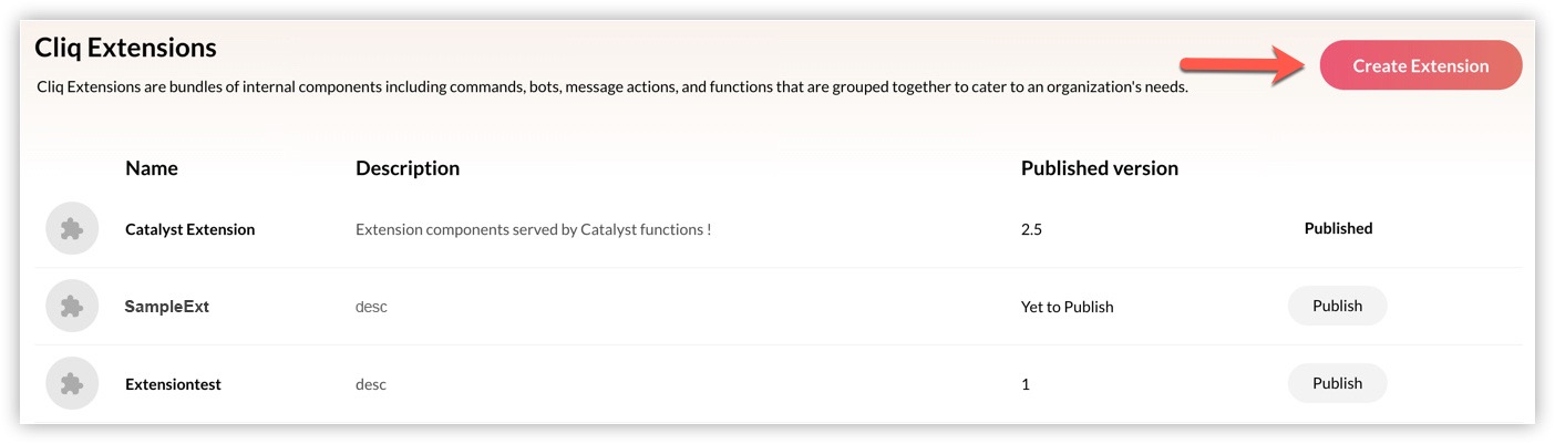 - The index page contains all the extensions you develop in your Cliq account. Click Create Extension.