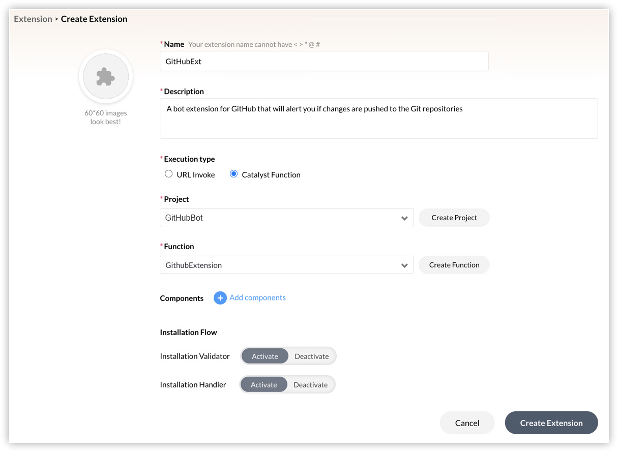 - Select the execution type as Catalyst Function. Select the Catalyst project GitHubBot that we created for this tutorial and the GithubExtension function from the dropdown lists.