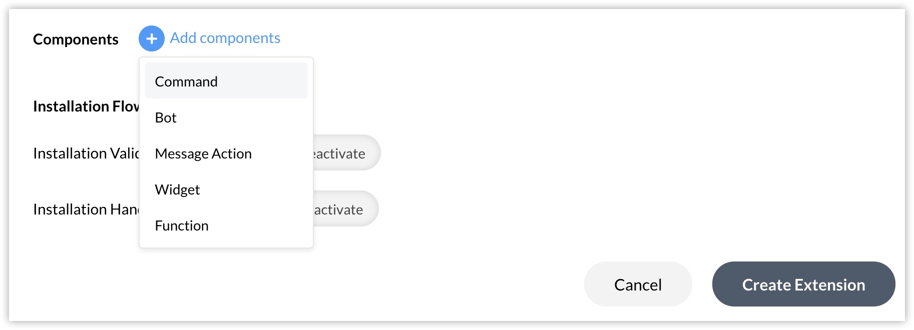 We can now add the components that we will require for this extension. - Click Add components, then click Command.
