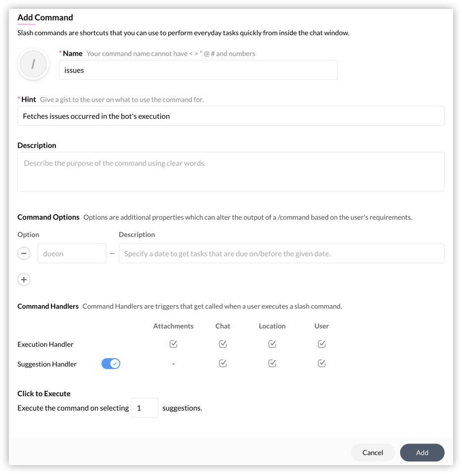 - Enter the command's name as "issues". Configure it as shown in the image below. Click Add.