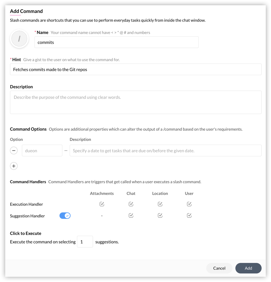 The Cliq bot will now be available in your Cliq account. The issues and commits commands, along with the Repos menu action will work in the bot.