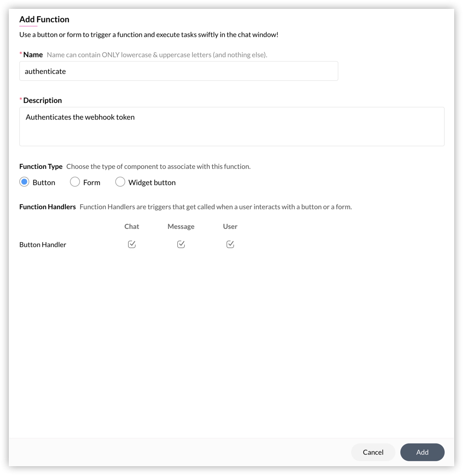 - Next, add a function component and configure the "authenticate" function as shown below.