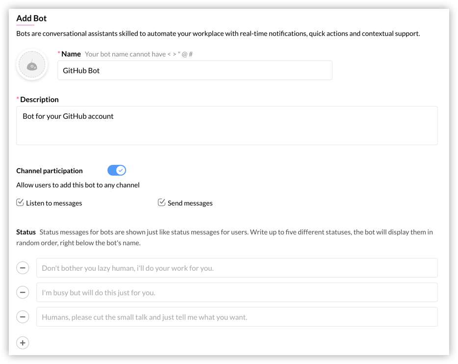 - Finally, add a bot component and configure the "GitHub Bot" as shown below.