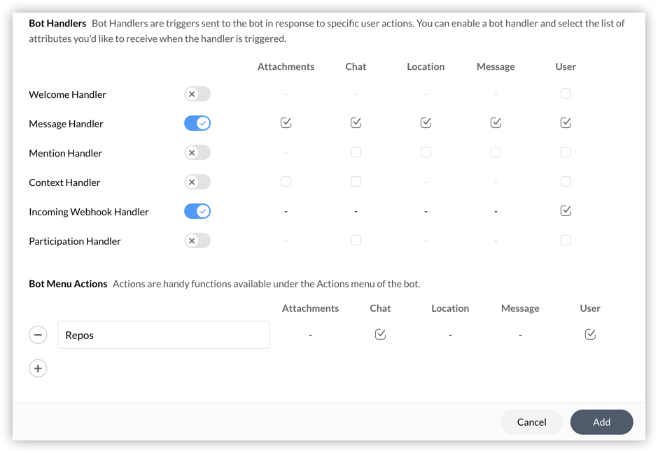 Enable the Message Handler and Incoming Webhook Handler, and select all the checkboxes. This will enable the bot to acknowledge messages in the chat and the webhook requests received from GitHub.