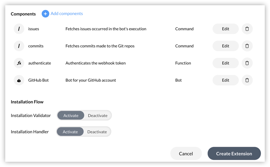 Note: Ensure that you have given the same component names as specified, because we have configured the same names in the function code. - After you add all the components, click Create Extension in the extension configuration page.
