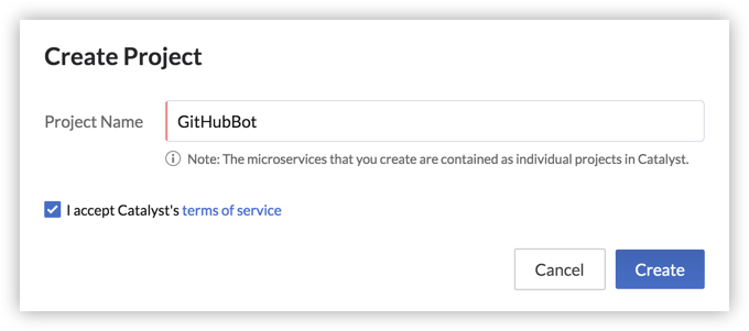 - Enter the project's name as "GitHubBot" in the pop-up window.