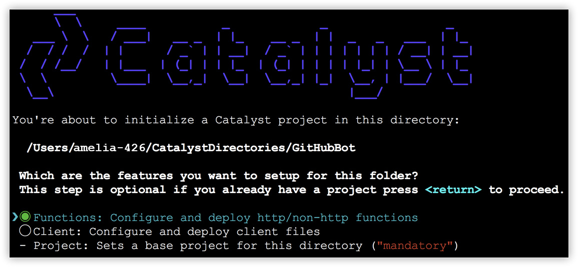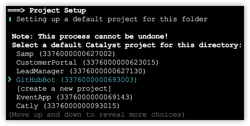 - The CLI will now ask you to associate a Catalyst project with the directory. Associate it with the project that we created earlier from the console. Select GitHubBot from the list and press Enter.