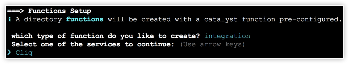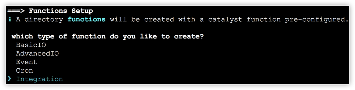 - The CLI will initiate the function setup. Select Integration as the function type.